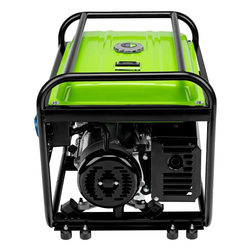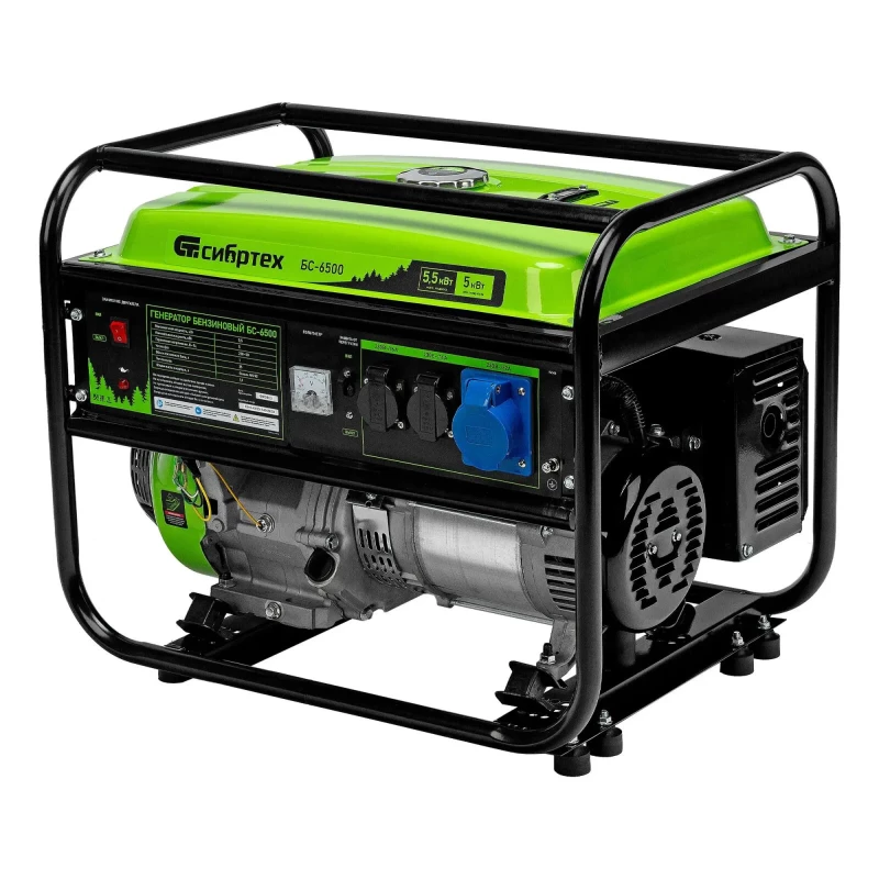Бензиновый генератор Сибртех БС-6500 94546 на 230 В, с 4-тактным двигателем, баком на 25 л и ручным стартером, выдает 5,5 кВт и подходит для создания целой электросети в загородном доме, магазине, мастерской или на строительной площадке. К нему можно одновременно подключить 5 ламп накаливания, холодильник, телевизор. Для подключения приборов предусмотрено 3 розетки. Одна из них силовая на 32А, что позволяет запитать мощное оборудование, например, электрическую плиту. Преимущества: Работа без скачков напряжения — благодаря блоку AVR к генератору можно подключать даже чувствительную технику. Простая эксплуатация — все элементы управления расположены на передней панели. Контроль рабочих параметров — встроенный вольтметр позволяет отслеживать напряжение в сети, а топливный индикатор — уровень бензина в баке. Защита поршневой группы — специальный датчик не допускает старт генератора с низким уровнем масла в картере. Низкий расход топлива — бака объемом 25 л хватает на 9,6 ч работы без дозаправки. Надежность — защита от перегрузки и короткого замыкания продлевает срок службы генератора. Стабильная работа двигателя — медная обмотка альтернатора и металлический распредвал выдерживают высокие нагрузки, система воздушного охлаждения обеспечивает эффективный отвод тепла. Прочная конструкция — стальная рама надежно защищает генератор от повреждений.