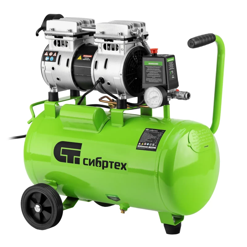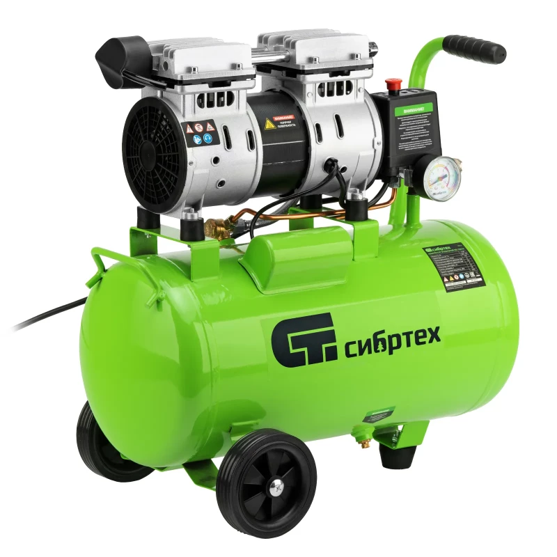 - Наименование Компрессор безмаслянный малошумный МБ 1100/24,1100 Вт, 24 л, 170 л/мин Сибртех