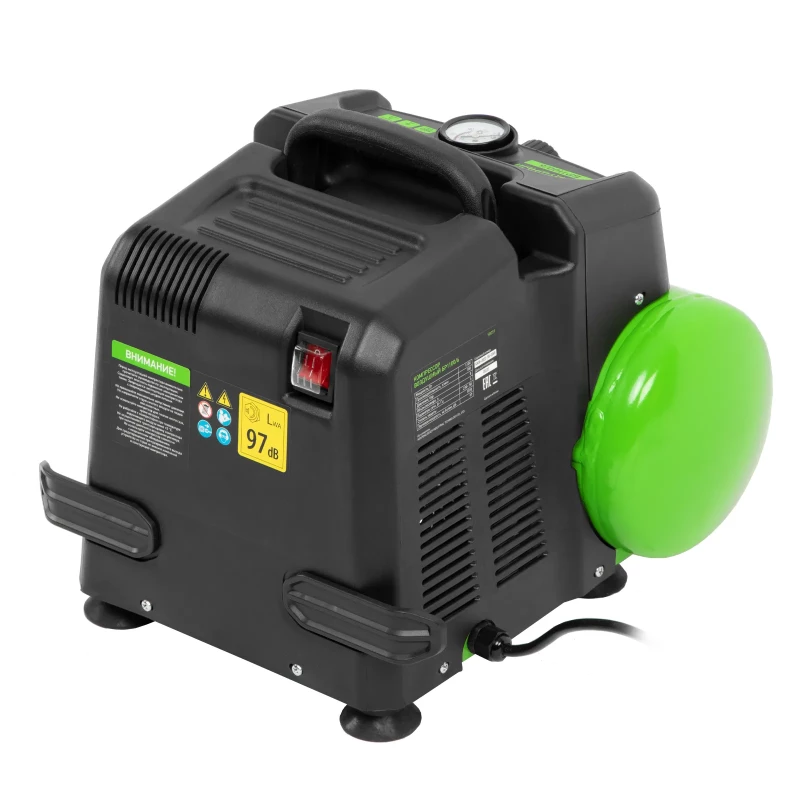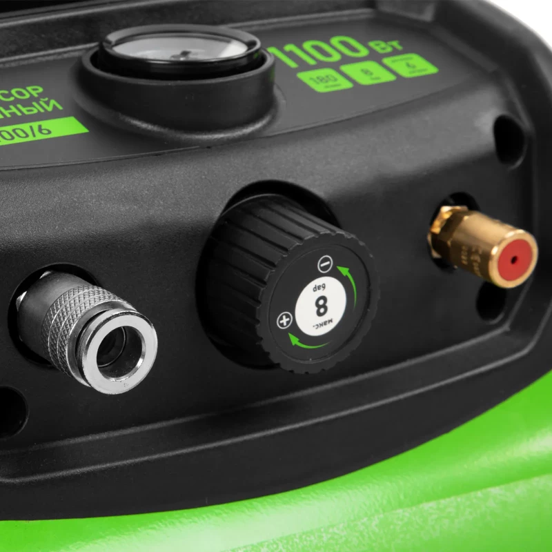 Воздушный безмасляный компрессор Сибртех BL 1100/6 58059 мощностью 1100 Вт, с ресивером емкостью 6 литров, служит для подачи сжатого воздуха под давлением до 8 бар со скоростью 180 л/мин. К нему можно подключить краскораспылитель, продувочный пистолет, заклепочник, пистолет для накачки шин и другой пневмоинструмент. Отсутствие масла делает компрессор оптимальным для выполнения покрасочных работ и продувки электронных компонентов. Устройство предназначено для бытового использования. Одна из основных особенностей данной модели — компактность и удобство в перевозке. Компрессор отличается небольшим весом и дополнен эргономичной транспортировочной ручкой. Преимущества: Автономность — прессостат обеспечивает автоматический запуск двигателя и его остановку в зависимости от уровня давления в ресивере. Простая подготовка к работе — быстроразъемный выходной коннектор «Рапид» (евро) позволяет легко подключить пневмоинструмент. Удобное управление — при помощи поворотного регулятора на передней панели можно установить нужное значение давления. Контроль давления в ресивере — в верхней части корпуса расположен манометр, для считывания показателей не нужно наклоняться. Предохранительный клапан — возможность сброса избыточного давления позволяет избежать аварийных ситуаций. Продуманная конструкция — виброгасящие опоры обеспечивают устойчивость компрессора во время работы.