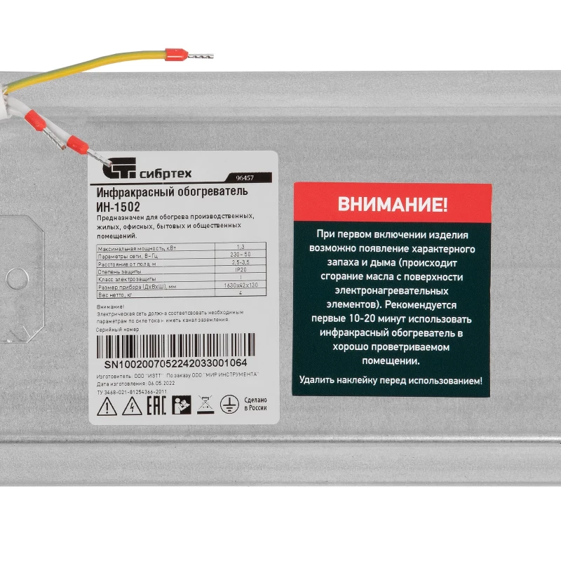 Инфракрасный обогреватель Сибртех ИН-1502 96457 подключается к сети 230 В, потребляет мощность до 1400 Вт и предназначен для создания комфортных температурных условий в помещении в холодное время года. Служит основным источником тепла на площади до 13 кв. м и дополнительным — в помещениях до 26 кв. м.