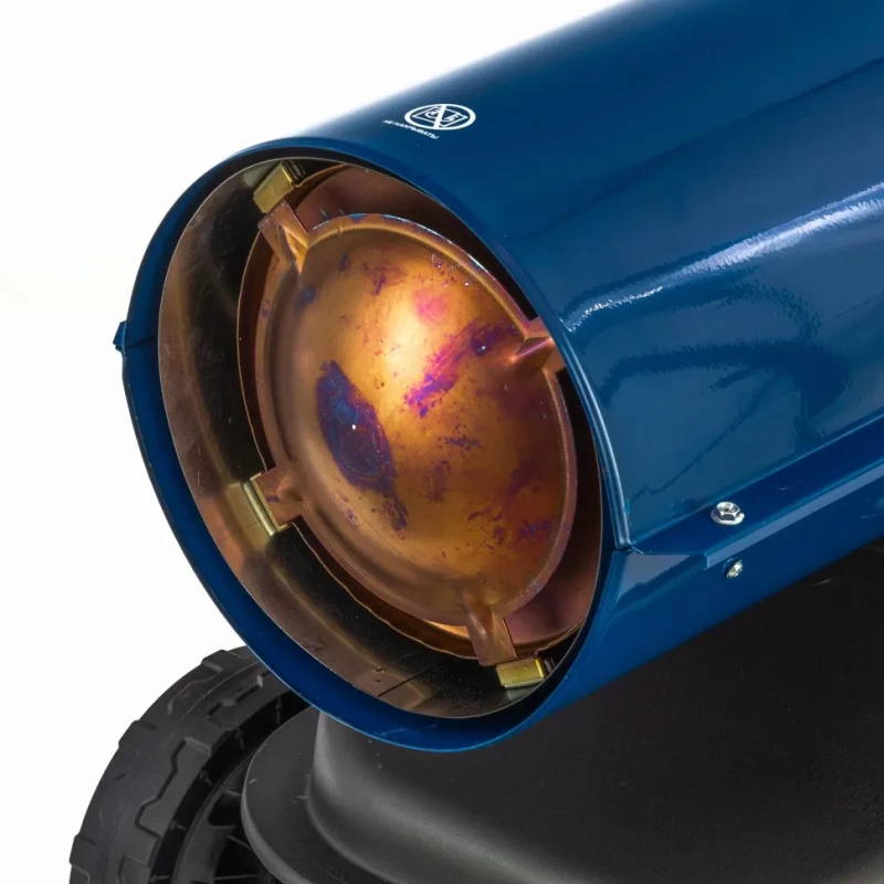 Преимущества: Пушка может работать с любым видом дизельного топлива: летним, зимним и арктическим. Встроенная система безопасности в случае затухания пламени, обесточивания или перегрева отключает подачу топлива. Теплоотражающий экран служит для равномерного прогрева помещения, не допуская потери тепла. Встроенный фильтр грубой очистки предохраняет топливную систему от засорения частицами грязи. Система прямого нагрева не допускает рассеивания теплого воздуха, направляя его на конкретную точку для быстрого обогрева. Специальный датчик облегчает контроль уровня топлива для своевременной заправки. Пушку легко транспортировать и перемещать по рабочей площадке благодаря подставке с ручкой и колесами.
