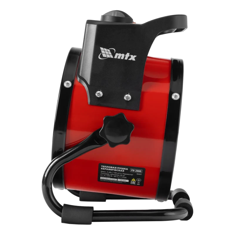 Керамическая тепловая пушка MTX FH-2000 98401 с термостатом, максимальной мощностью 2 кВт, работает в 2 режимах и предназначена для обогрева складов, мастерских и других нежилых помещений площадью до 20 м2. Также может использоваться для быстрой просушки различных поверхностей, например, стяжки пола, оштукатуренных и окрашенных стен.
