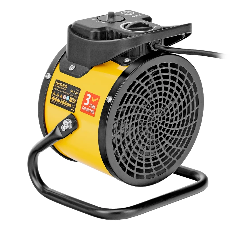 Тепловая пушка (тепловентилятор) Denzel DHC 2-100 96429 с керамическим нагревателем потребляет мощность 0,025, 1 или 2 кВт и пригодится в любую погоду: в холод она обогреет помещение, а в жару ее можно использовать как вентилятор. Также применяется во время отделочных работ для просушки поверхностей — окрашенных и оштукатуренных стен, стяжек. Максимальной мощности 2 кВт хватит для обогрева помещения площадью до 20 кв.м. Работа тепловой пушки не доставляет дискомфорт, безопасна для здоровья людей и животных, поскольку керамический нагревательный элемент не сушит воздух и не выделяет вредных веществ.